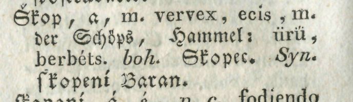 škop1, škopec m nem/čes 1. vykastrovaný baran: na Welkem prislope walaski dobytek: sskopy stare no 3 (LIETAVA 1611); sskopecz gest baran, kteremu mossna gest odnata (KoB 1666); widel za chrbatem sskopca ležiciho mezj trnjm za rohj, wzal tehdj sskopca a obetowal s neho obet zapalnu (ZP 1716); castratus vervex: sskopec (KrN 1795); x. pren taky sskopcy neb capy gsu chlipnicy, ktery w bahne telesnych žadosty a rozkossych zustawagu a se walagu (MC 18. st) 2. súhvezdie, hviezdne znamenie Barana: cirkel dwanacte nebeskjch znamenj, Sskopec (KoB 1666); gar sa začina, kdiž po zime deň a noc rowne su, to gest, kdiž slunce do znaku Sskopcza wstupi w márcziusy (BUDÍN 1781) 3. baranidlo, búrací nástroj: y kosse obraňugjcé y sskopcú priprawi na zboreni zdi, y weže twé pokazj s nástrogem swym wogánskym; y dáss proty ňemu wogsko a položjss okolo skopcú na zborenj zdi (KB 1757) 4. bot durman obyčajný Datura stramonium: datura: sskopec meňssy (KS 1763) 5. chlap, silák: petro: sskopec, alij chlap, horák (KS 1763) P. atpn Sskopecz (BOCA 1591); Sskopczowa (ZVOLEN 1592); -cový, -ový príd k 1: od welkeg oučeg a sskopoweg koži d 4 (ŽILINA 1702); sskopowi log (KRUPINA 1739); arietinus: sskopowy, baránny; arietinum: sskopcowé gátra (KS 1763); -ček dem k 1: Juhasz mal skopi 12, jahnicsek 37, skopcseki 25 (JACOVCE 1778); vervex: skop, sskopček (PD 18. st)